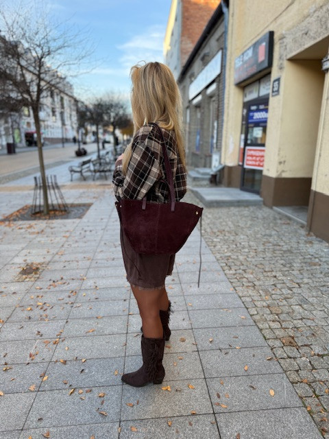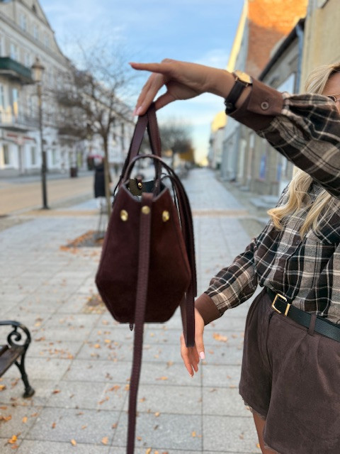 Przepiękna, elegancka torebka ze skóry naturalnej zamszowej. Kolor- bordowy. Guziki oraz zapięcia złote. Posiada licowe ramiączka- krótkie oraz długie. W środku torebki dodatkowo kosmetyczka. Polecamy- torebka niezbędna każdej kobiecie! Jednym słowem klasyka.