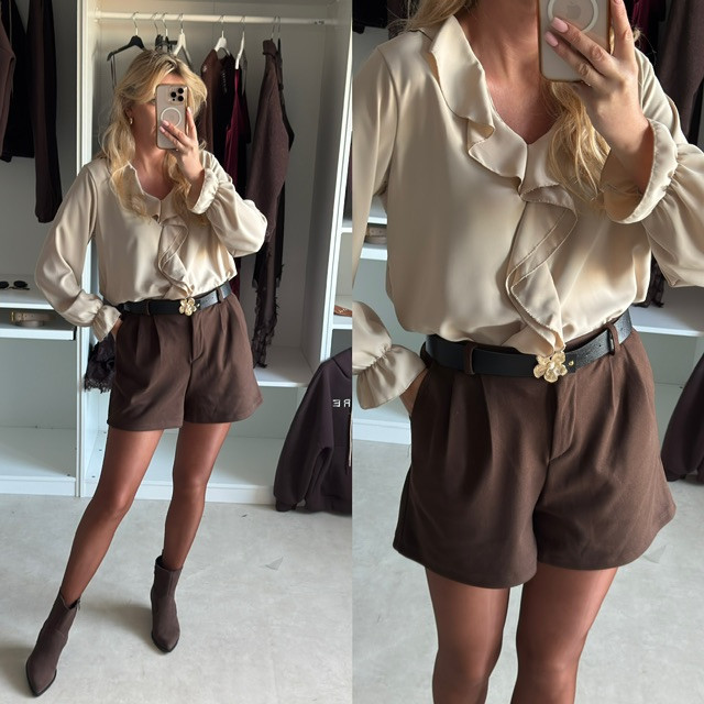 Hit- pełne elegancji spodenki, włoskiej produkcji w rozmiarku uniwersalnym. Uszyte z przyjemnej w dotyku, uciągliwej dzianiny, posiadają ściągacz w pasie. Są zapinane na suwaczek, w zestawie z czarnym paskiem z piękną złotą klamrą w kształcie kwiatka z perełką. Dostępne w trzech kolorkach: beżowym, czerni oraz kawowym brązie.