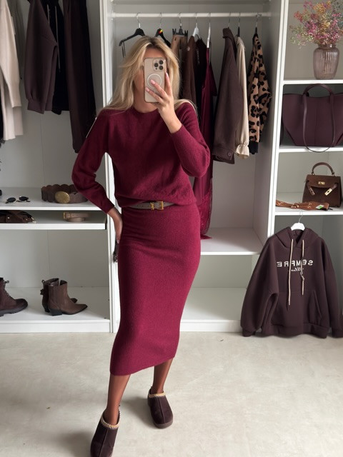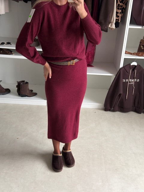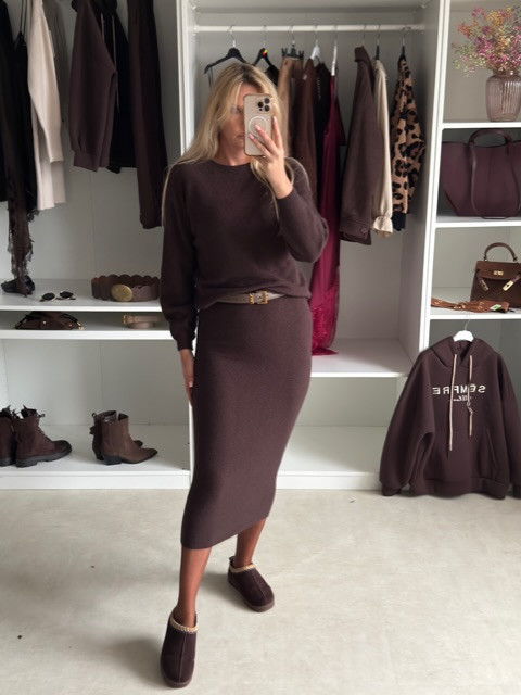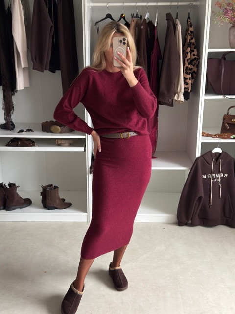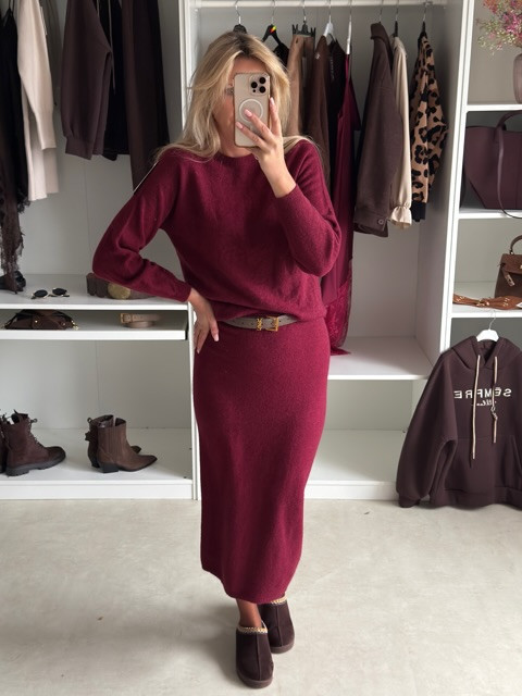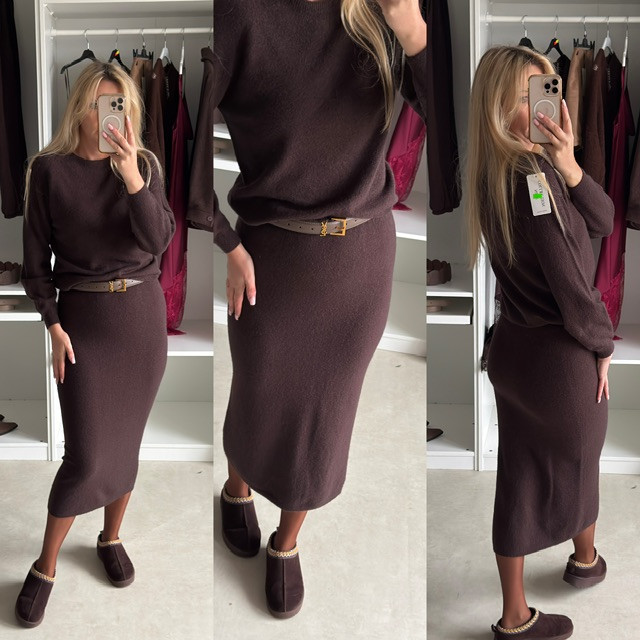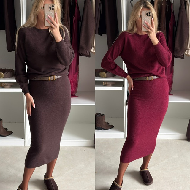 Przepiękny komplet- sweterek o okrągłym dekolcie oraz spódnica midi. Niesamowicie prezentuje się na sylwetce, przy czym otula ciepłem. Jest to fantastyczna opcja dla każdej z Nas- pasuje na wiele okazji. Idealny do pracy, na spotkania czy na codzień. Dostępny w kolorze brązowym oraz bordo. Serdecznie polecamy!