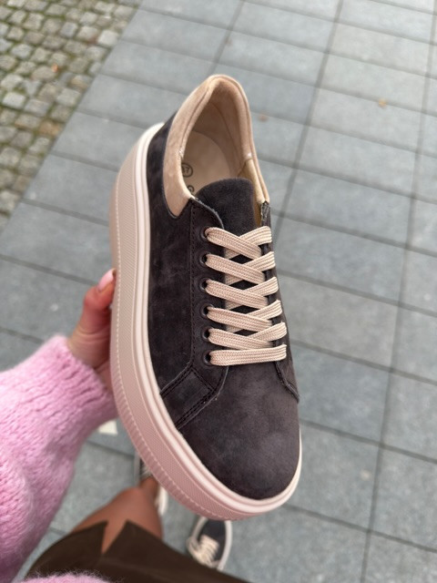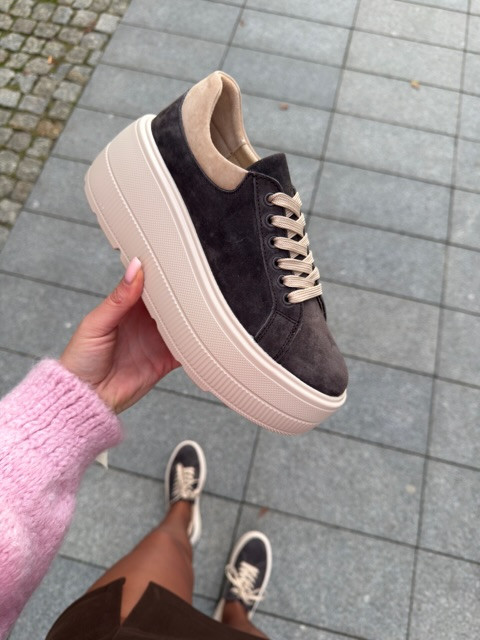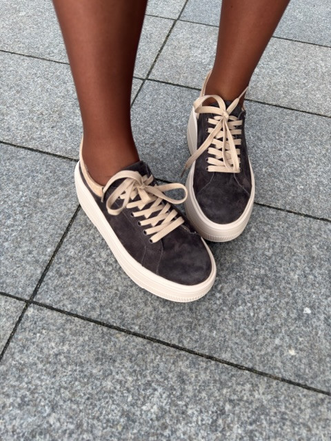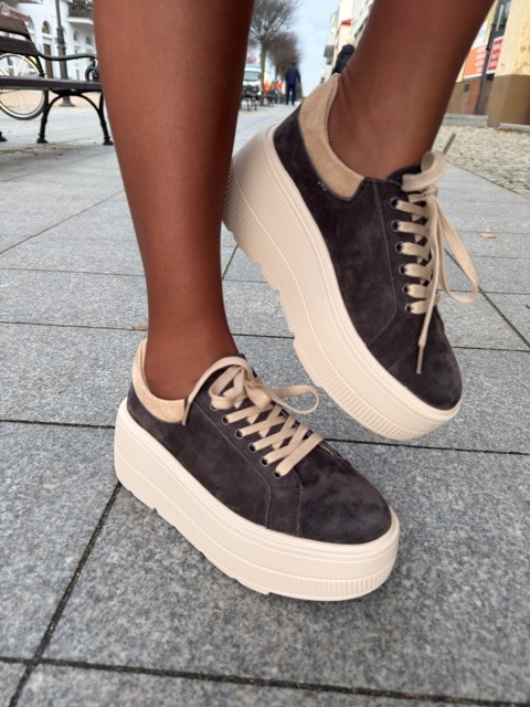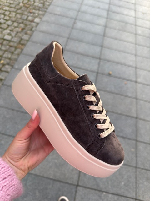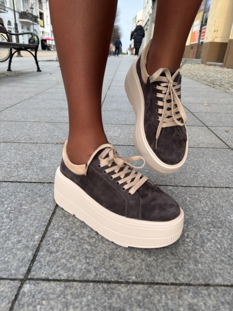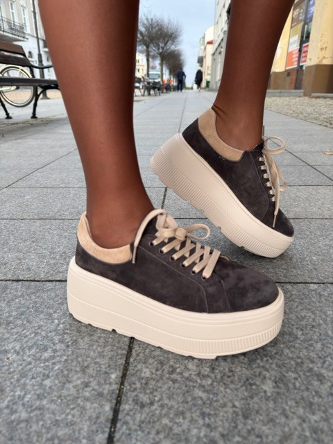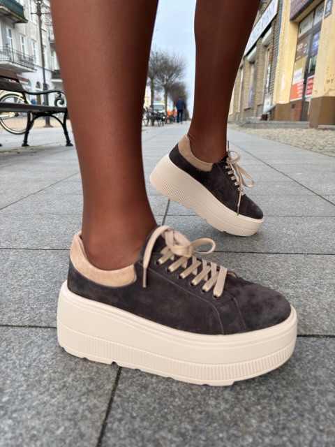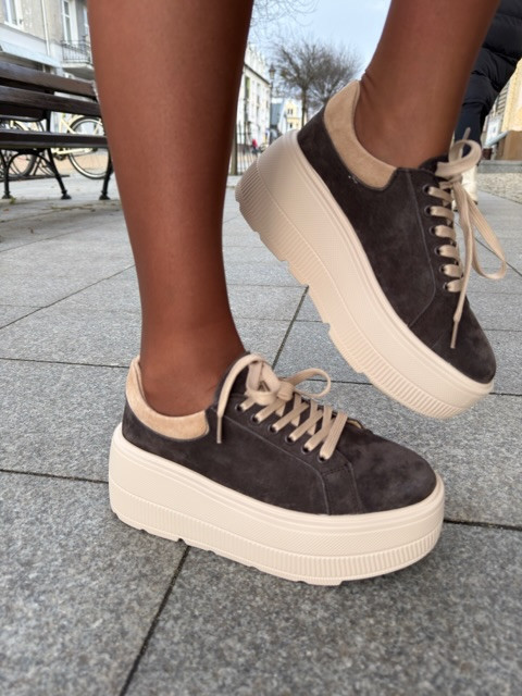 Te sneakersy w kolorze gorzkiej czekolady są świetne- leciutkie i bardzo wygodne. Wyższa podeszwa to idealny wybór do jeansów dzwonów czy sukienek.
