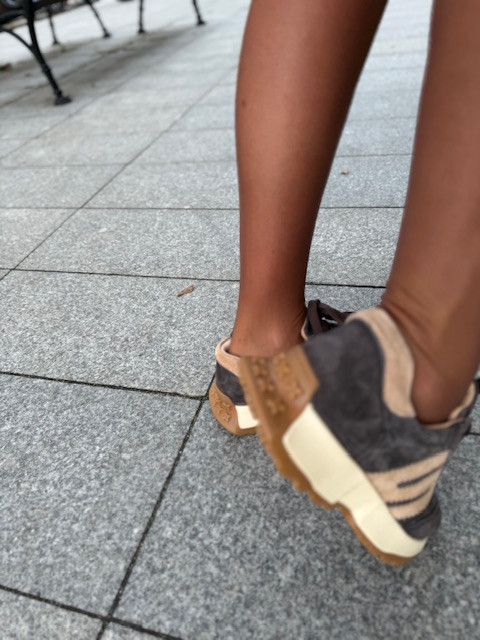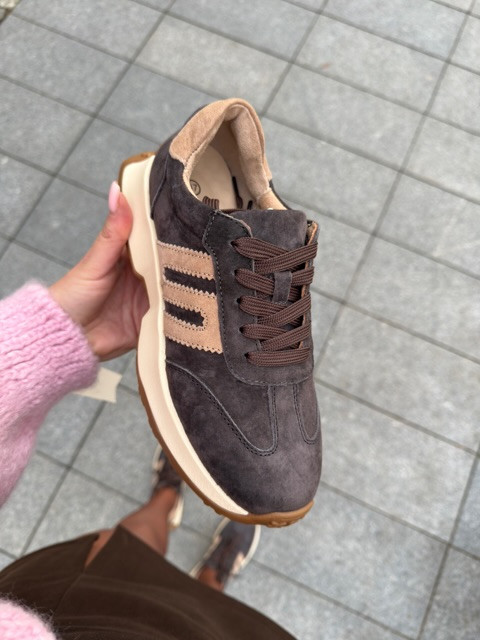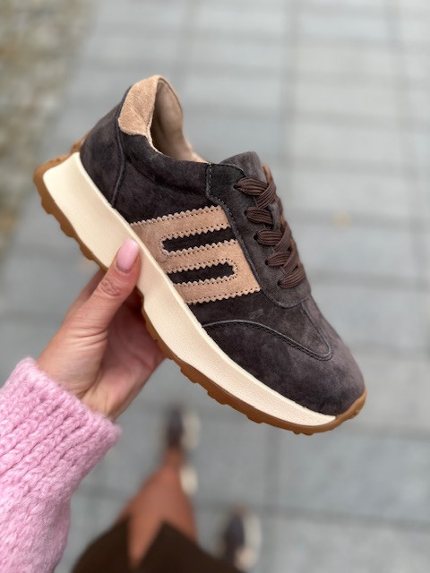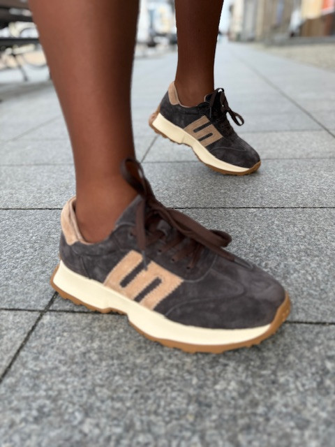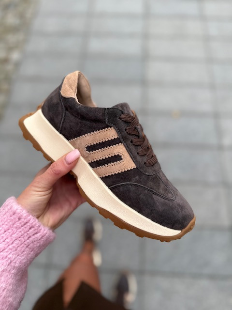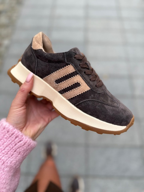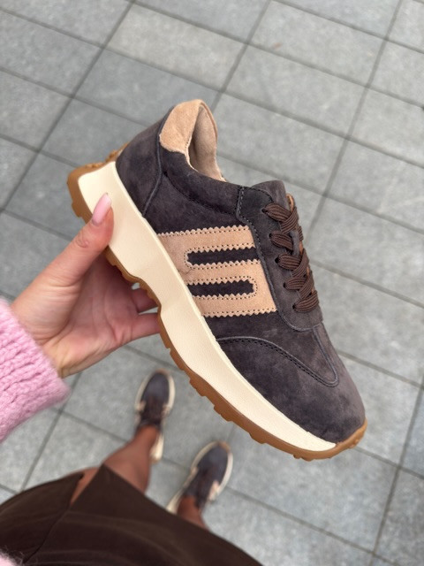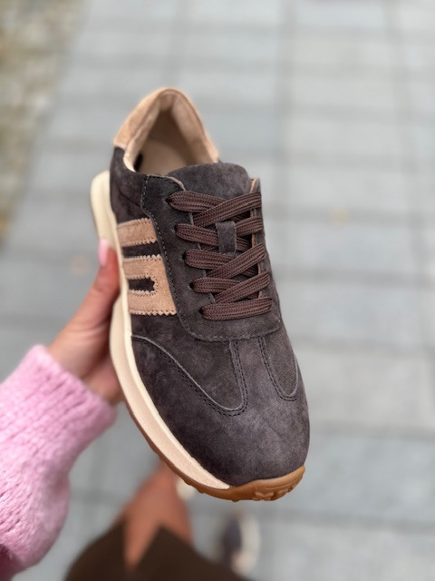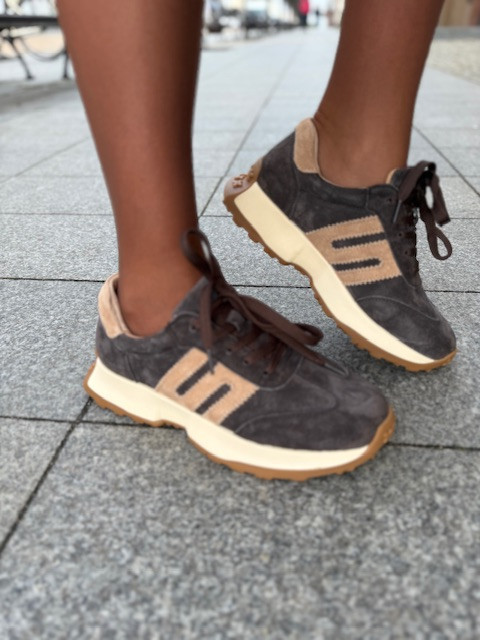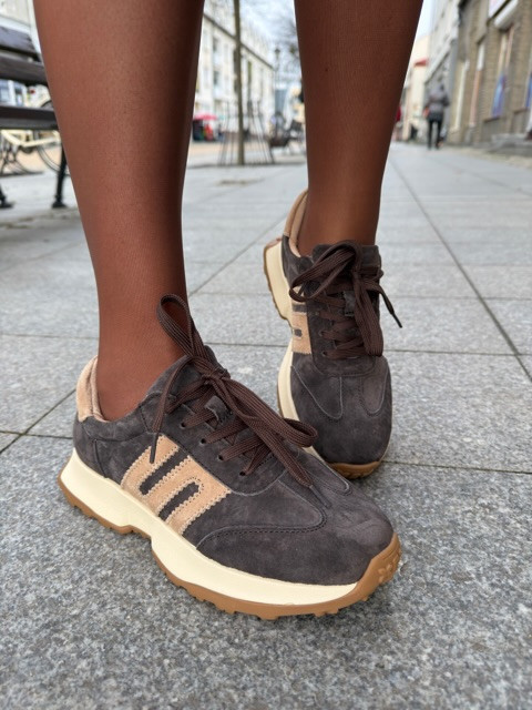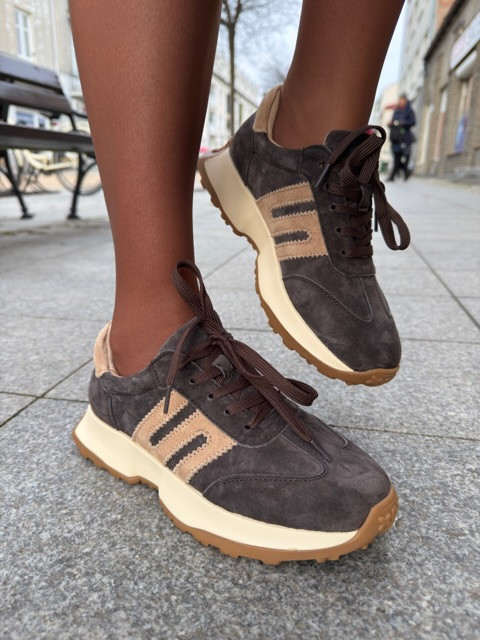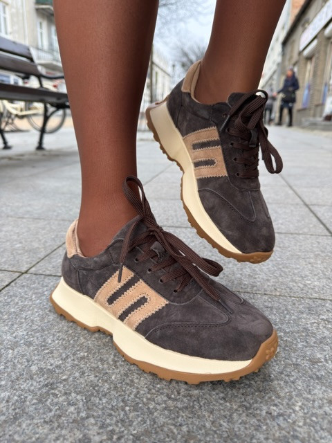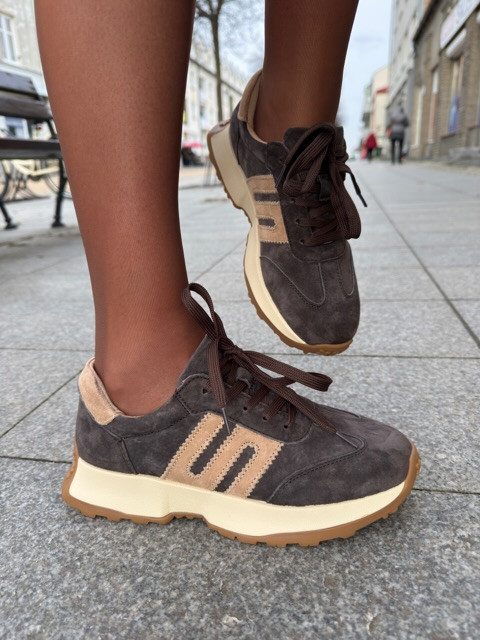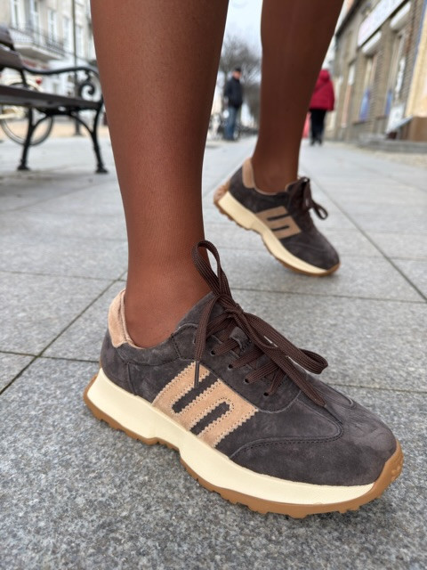 Serdecznie polecamy te wszechstronne sneakersy, idealne do każdej stylizacji. Występują w kolorze gorzkiej czekolady, mają brązowe sznurówki, beżową cholewkę, beżowy pasek oraz podeszwę z pięknym wzorkiem. Są również wygodne i leciutkie.