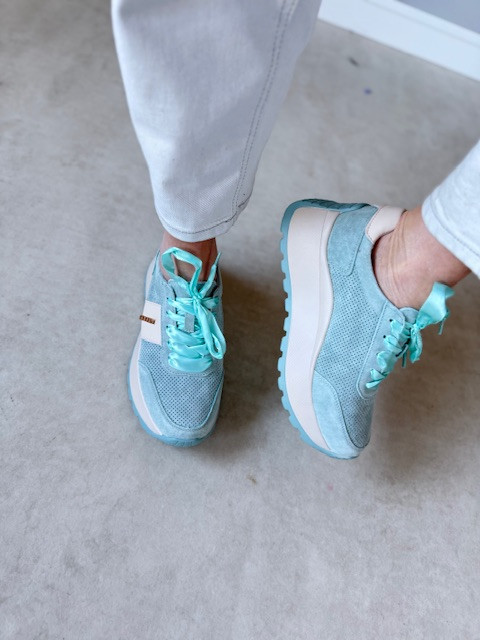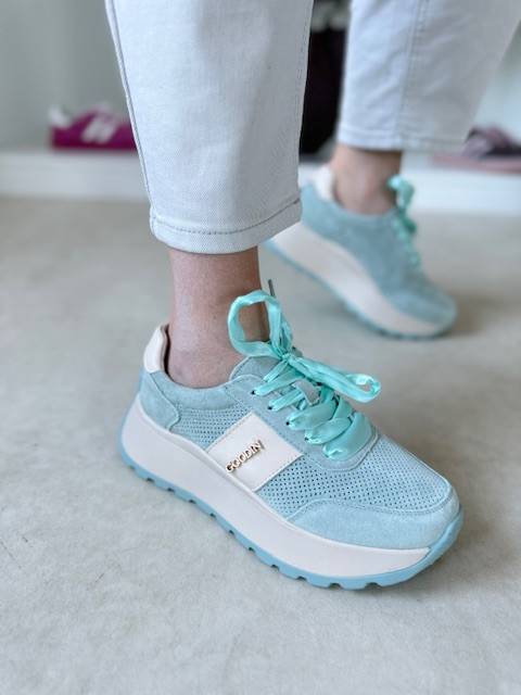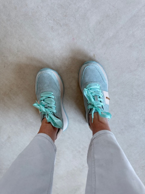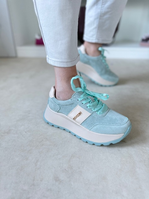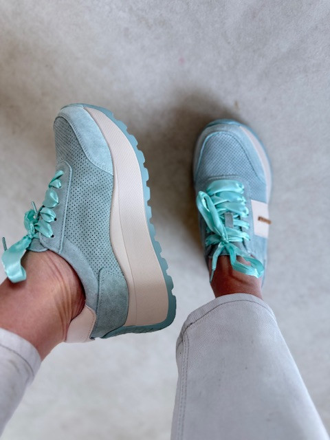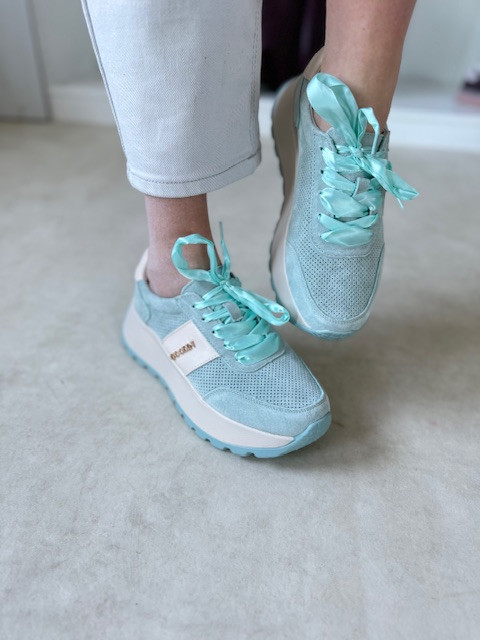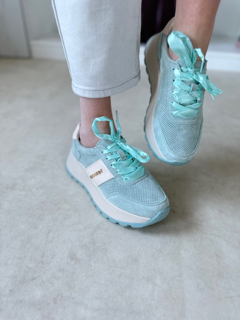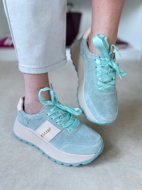 Piękne sneakersy ze sznurówkami ala wstążka i ze złotą ozdobą. O wyższej podeszwie, w kolorze mięty i jasnego beżu.