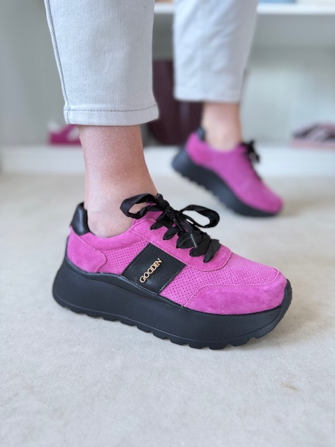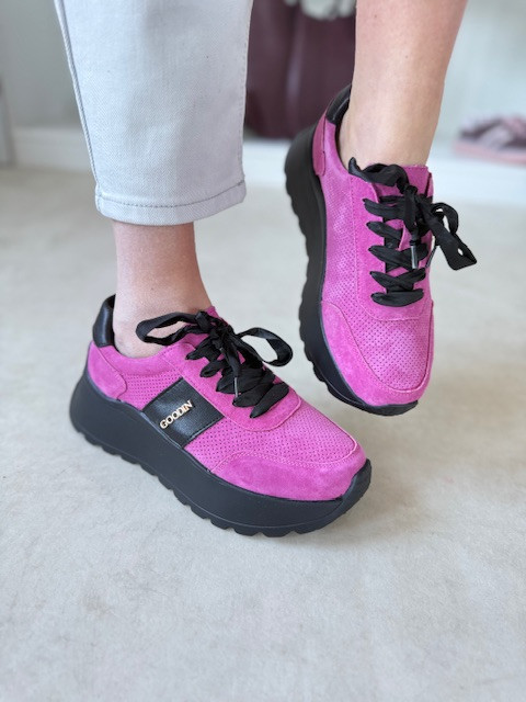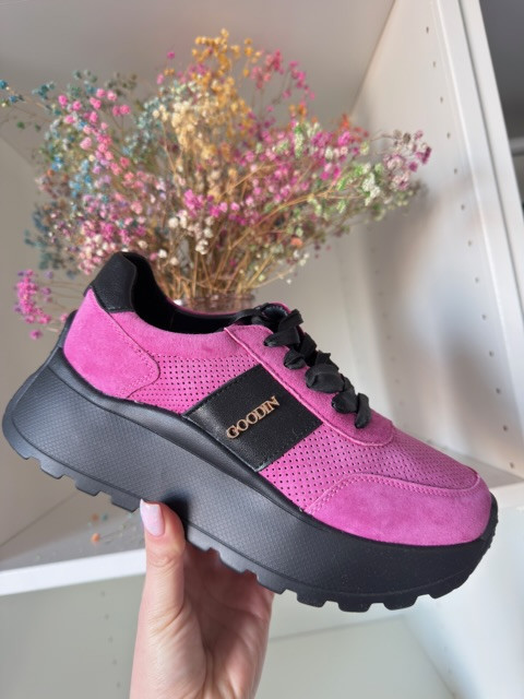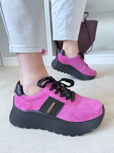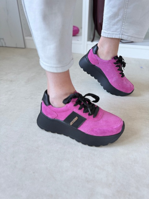 Piękne sneakersy ze sznurówkami ala wstążka i ze złotą ozdobą. O wyższej podeszwie, w kolorze fuksji i czerni.