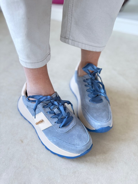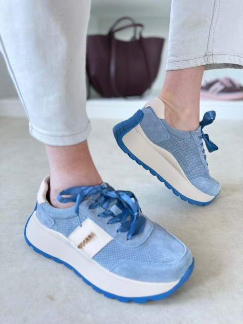 Piękne sneakersy ze sznurówkami ala wstążka i ze złotą ozdobą. O wyższej podeszwie, w kolorze niebieskim oraz jasnego beżu.