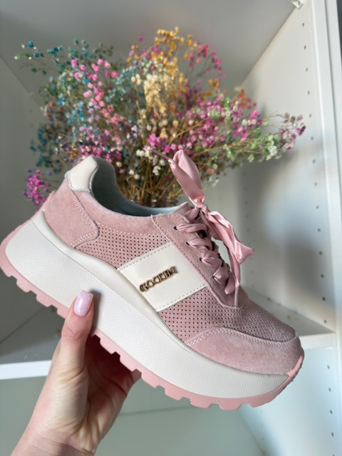 Piękne sneakersy ze sznurówkami ala wstążka i ze złotą ozdobą. O wyższej podeszwie, w kolorze pudrowego różu i jasnego beżu.