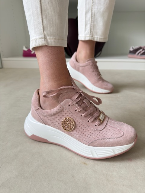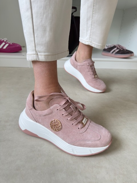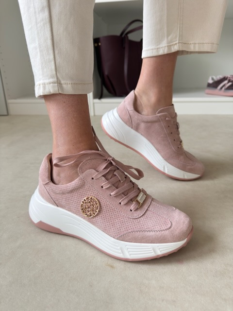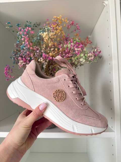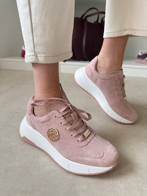 Przepiękne sneakersy. Ze skóry zamszowej, ze złotą ozdobą.