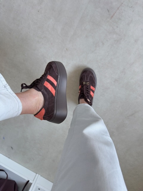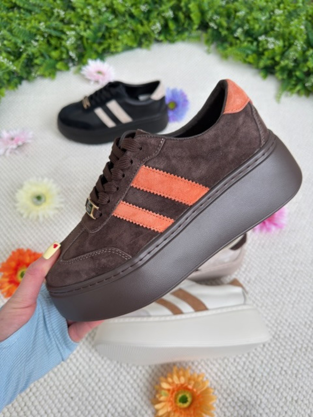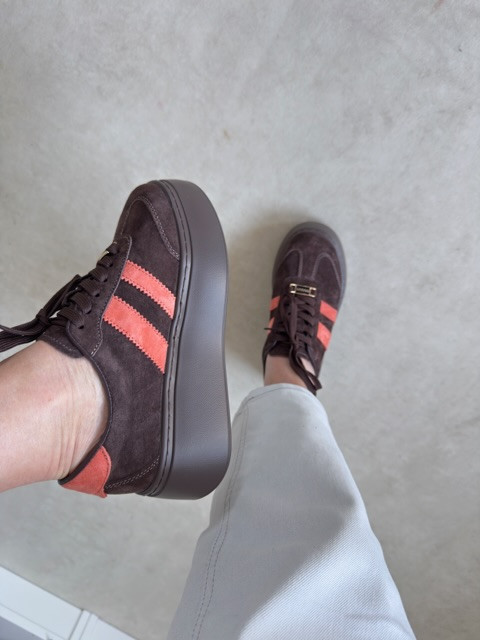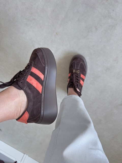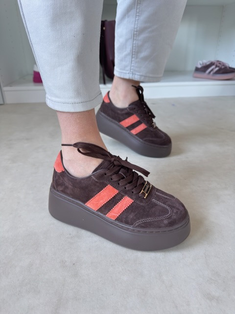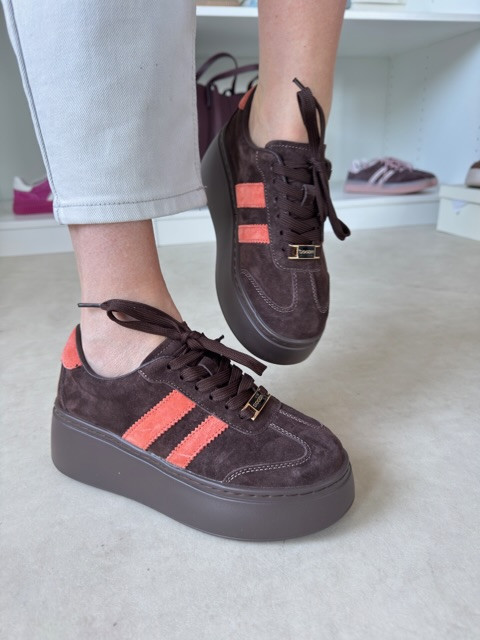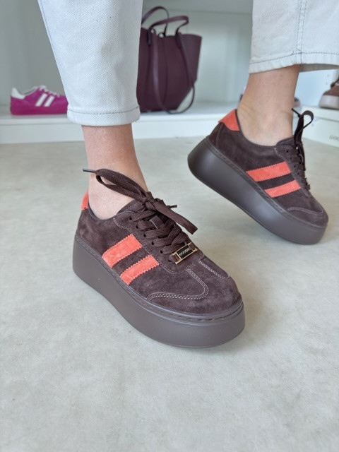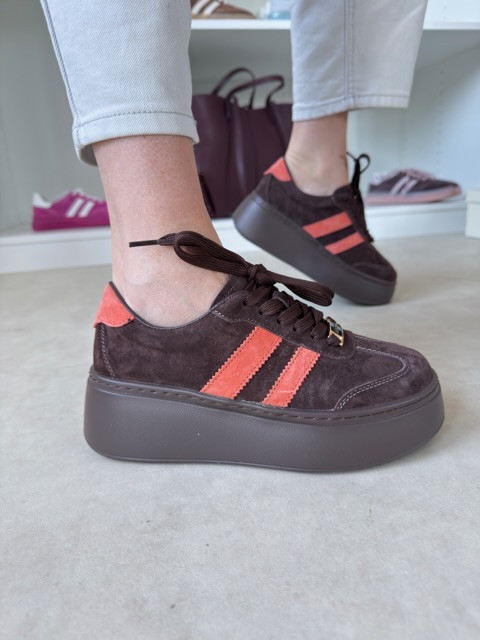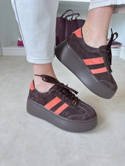 Stylowe zamszowe sneakersy na wysokiej podeszwie. Piękny kawowy odcień z kolorowym akcentem.