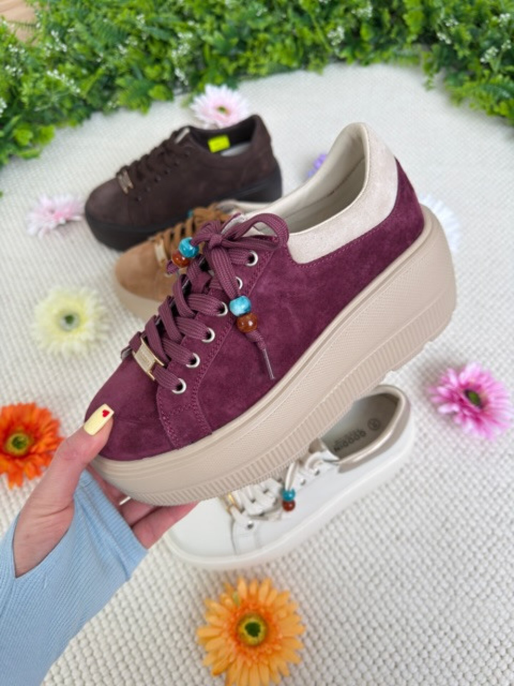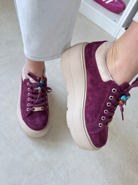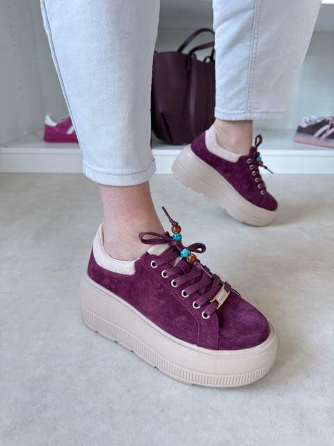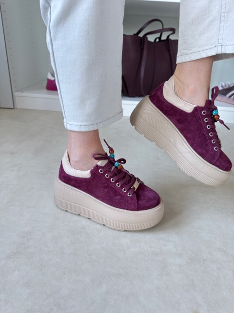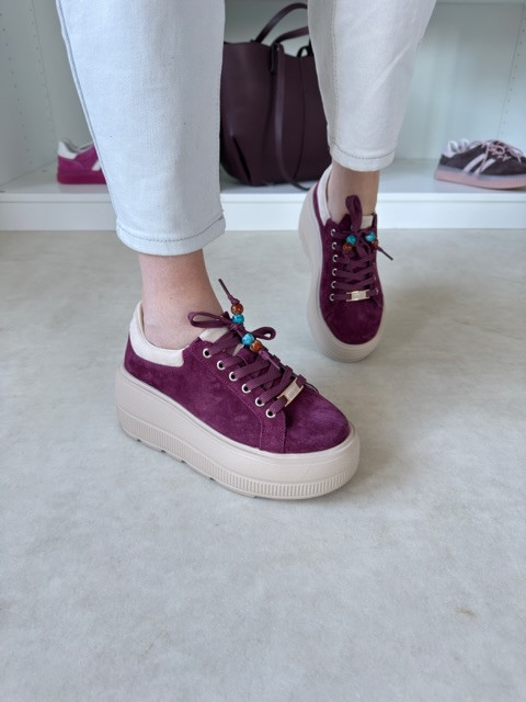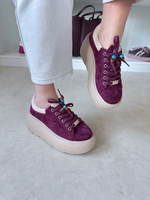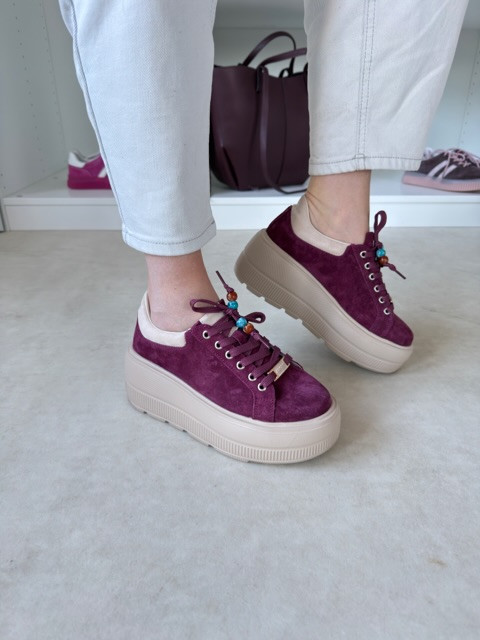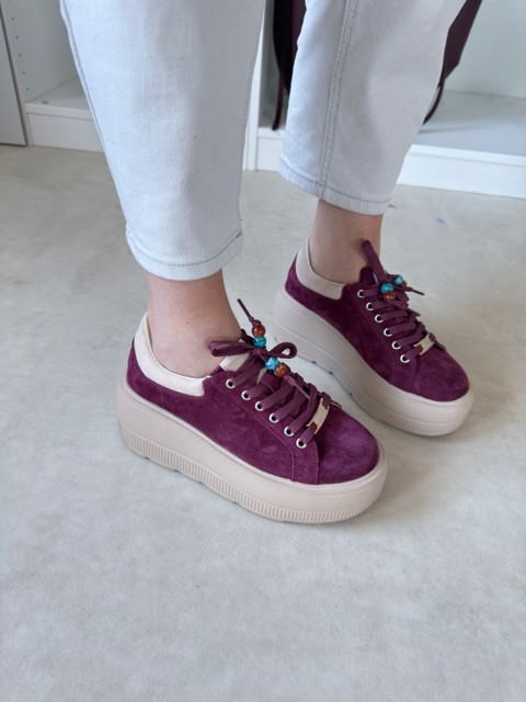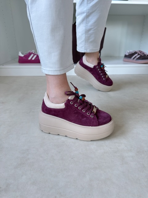 Piękne burgundowe sneakersy na wysokiej beżowej podeszwie. But zamszowy, ze złotymi akcentami i ozdobnymi koralikami.