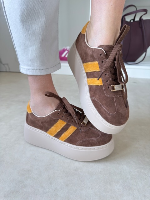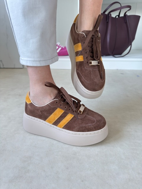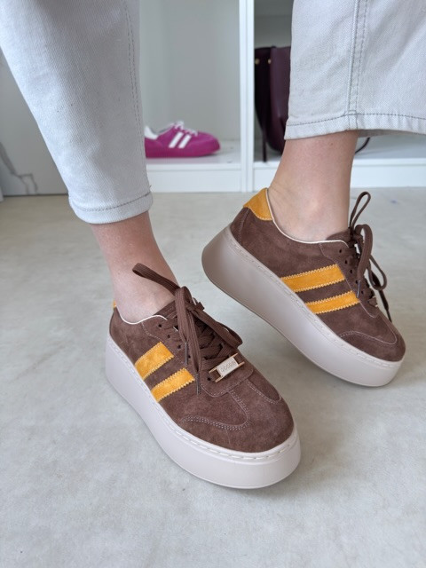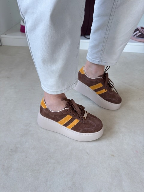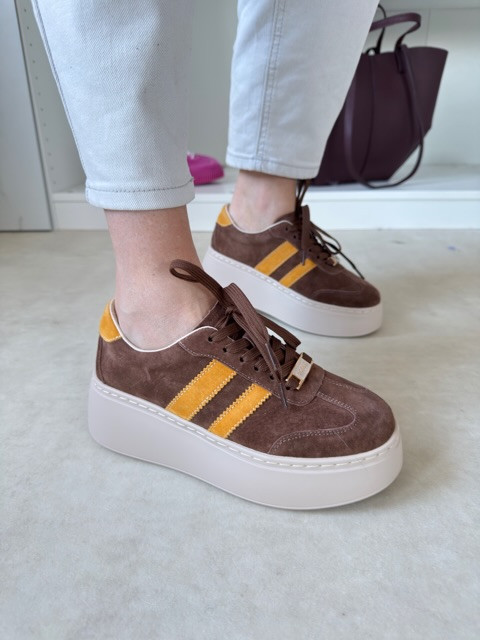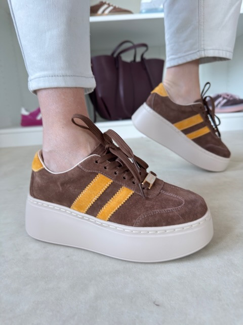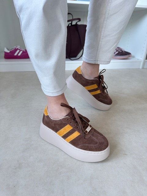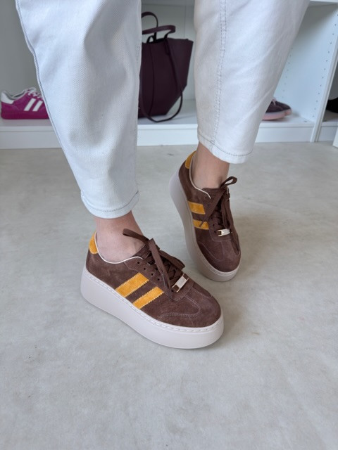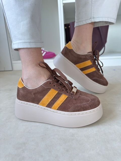 Stylowe zamszowe sneakersy na wysokiej podeszwie. Piękny brązowy odcień z kolorowym akcentem.