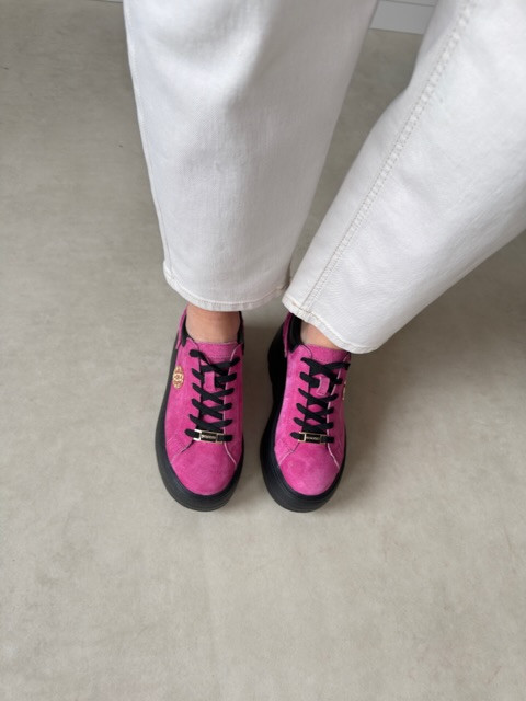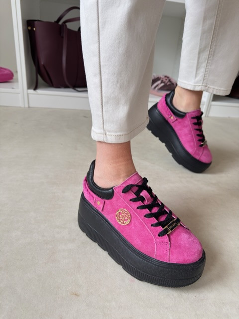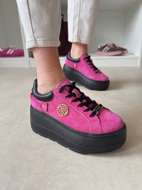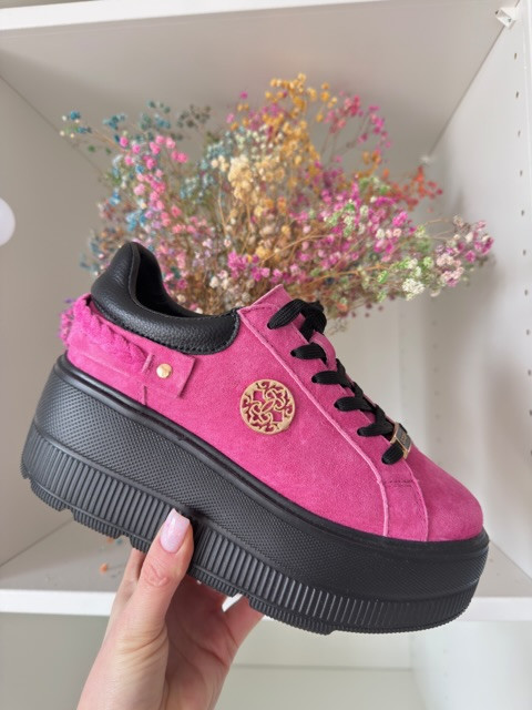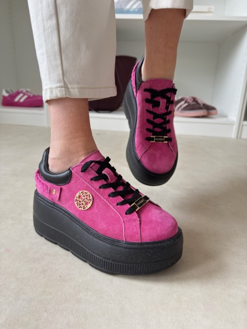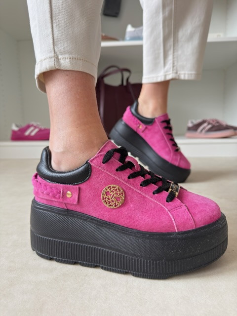 Sneakersy na wysokiej podeszwie ze złotymi ozdobami. W kolorze fuksjowym, z czarnymi sznurówkami.