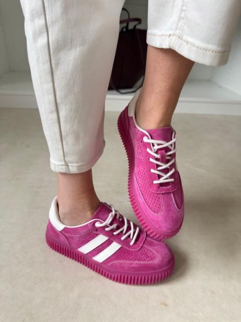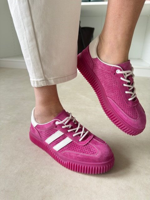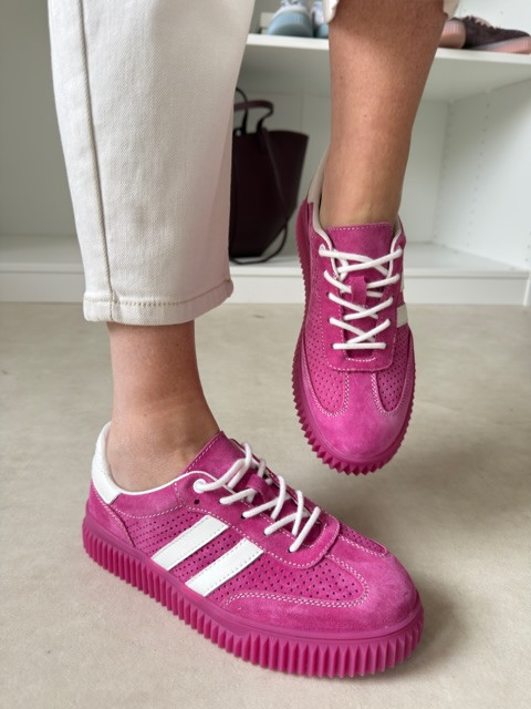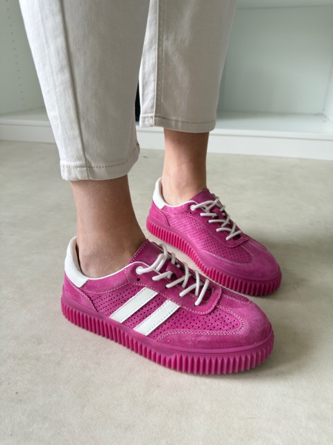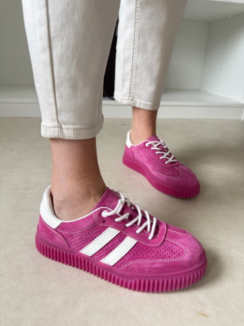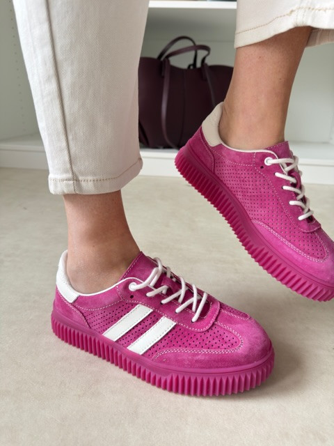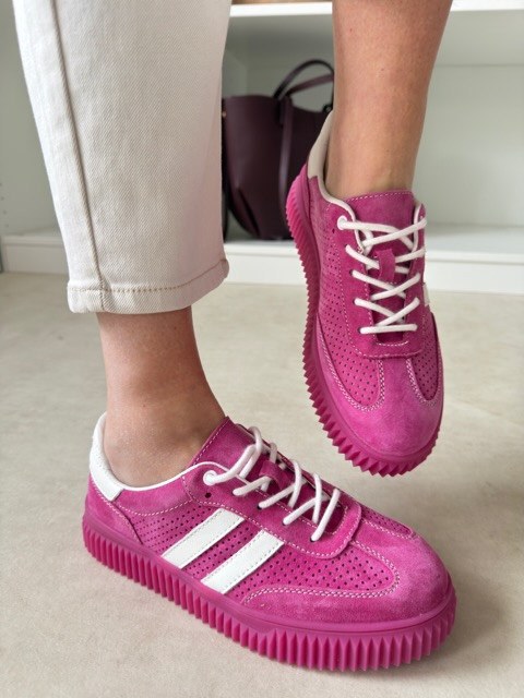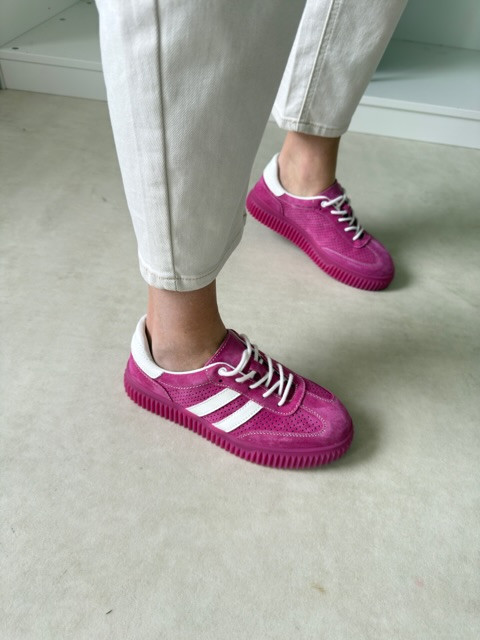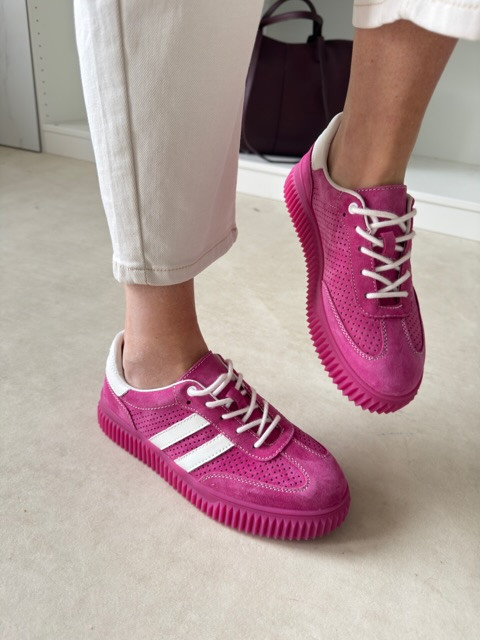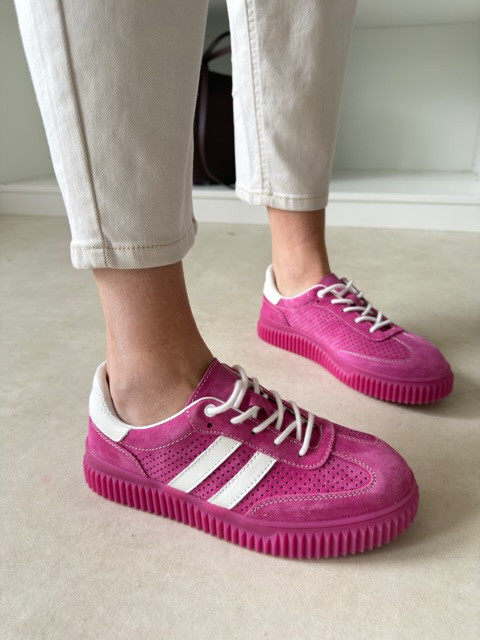 Sneakersy a'la samba o pięknym kawowym odcieniu z dodatkiem pudrowego różu. But zamszowy, na podeszwie gumowej.
