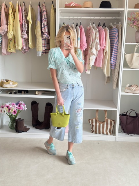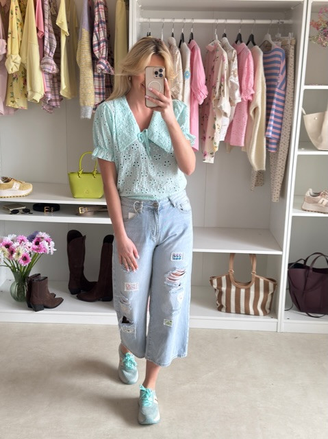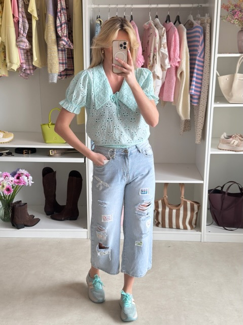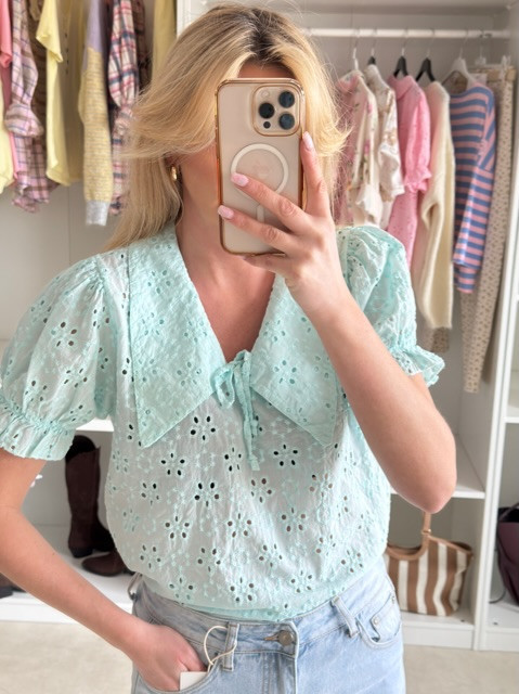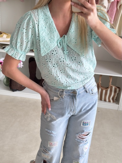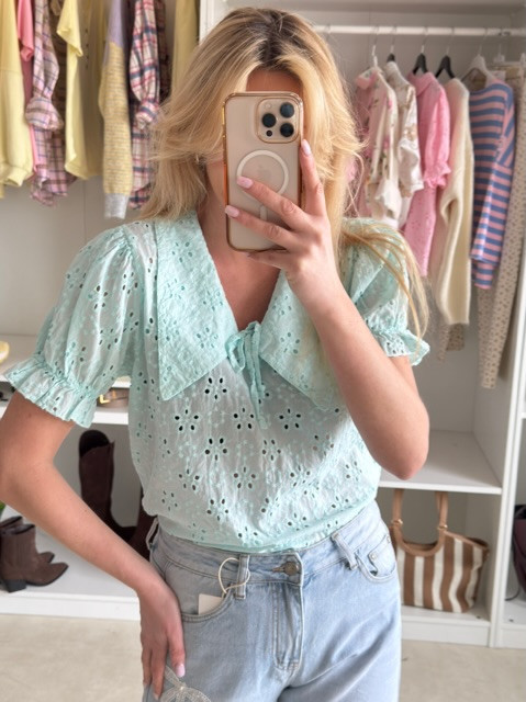 Piękna ażurowa koszula z bufiastymi rękawami oraz kołnierzykiem i dekoltem "V". Urocza oraz stylowa. O luźnym kroju, w uniwersalnym rozmiarze.